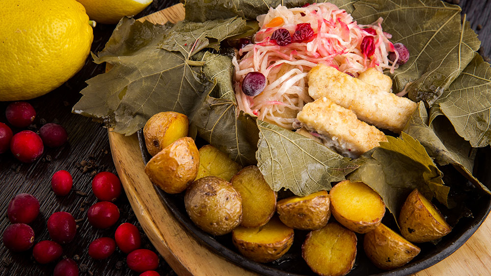 Из байкальского омуля шеф-повар готовит салат с обжаренным в сливочном масле молодым картофелем и листьями салата Мангольд (610 руб.), варит уху, добавив к омулю еще и муксун, томаты и сельдерей (500 руб.) и запекает в сковороде под маринованными виноградными листьями (710 руб.). Подается запеченный омуль с розмариновым картофелем и квашеной капустой с клюквой.