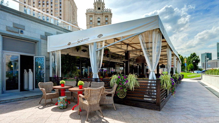 Недавно открывшаяся веранда ресторана Soluxe Club - это не просто сезонная постройка, а сооруженное по канонам фэн-шуй пространство. На диванах и креслах из ротанга одновременно могут расположиться 60 человек. Интерьер веранды Soluxe Club является продолжением оформления, принятого в ресторане: пастельные тона, зелень, подушки и «душа дома» - водопад, необходимый по китайской традиции.