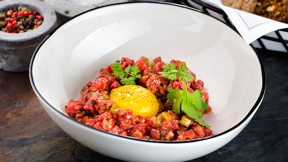 • Тартар из говядины и морского гребешка с мисо и карамелизированным фундуком