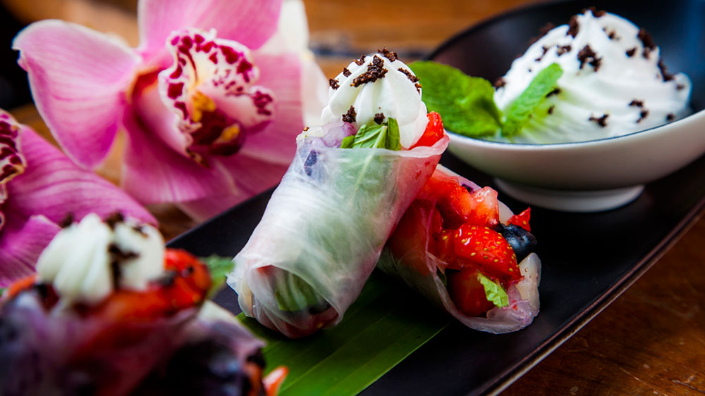 Главным десертом сезона с самого запуска Фестиваля спринг-роллов обещает стать фреш-ролл с тайскими фруктами (280 рублей) — и все благодаря имбирно-лаймовому соусу, который раскрывает сочетание вкусов тайского манго, помело и мяты. А в ягодном фреш-ролле с рамбутаном (390 рублей) смело уживаются свежая клубника, ежевика, голубика, мята, и для полноты картины рядом располагается соус из сливок.