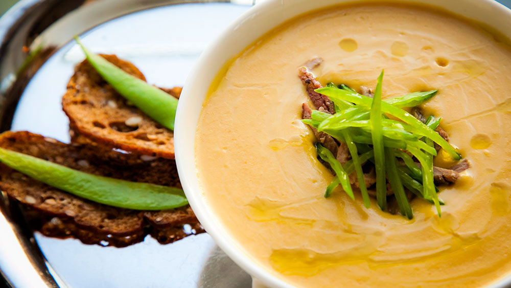 Из мясных закусок в меню появилась запеченная телячья вырезка (690 руб.). Ее подают с хреном, малосольным огурцом и сливочным соусом, украшают попкорном из гречневой крупы и черной солью. А раздел первых блюд пополнился крем-супом из нута с копченой утиной грудкой и зеленым горошком (580 руб.).