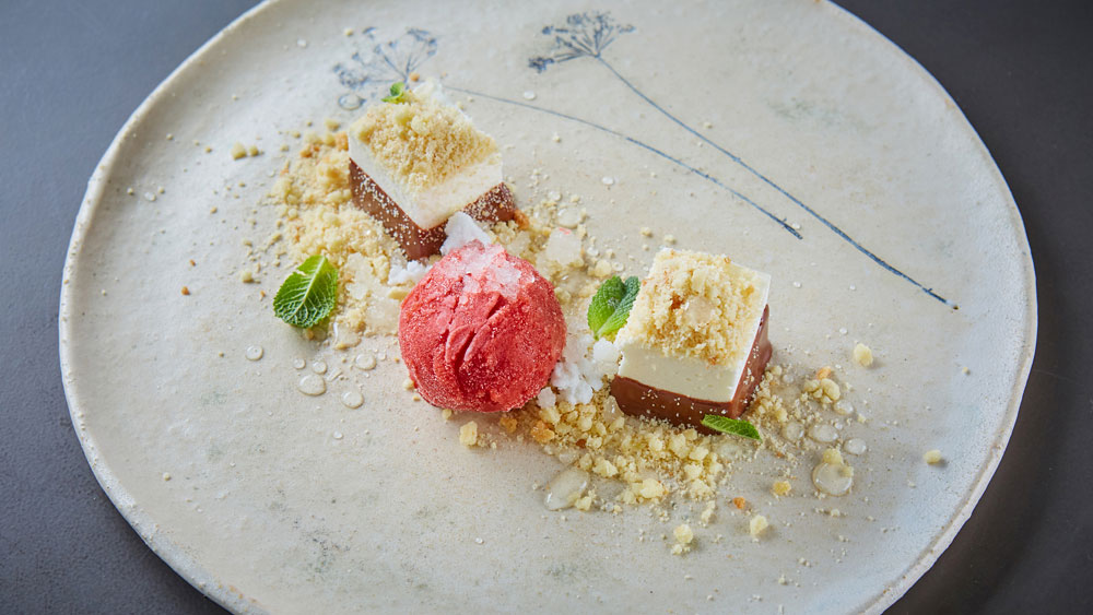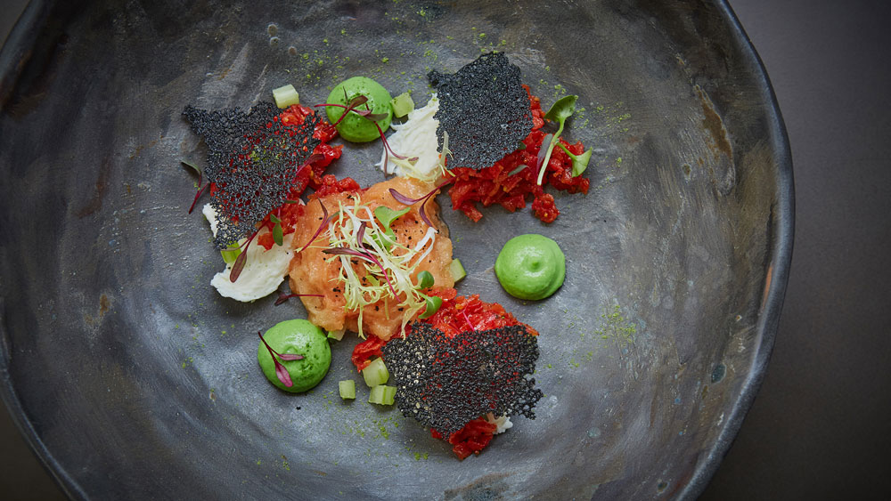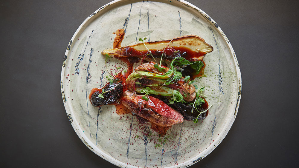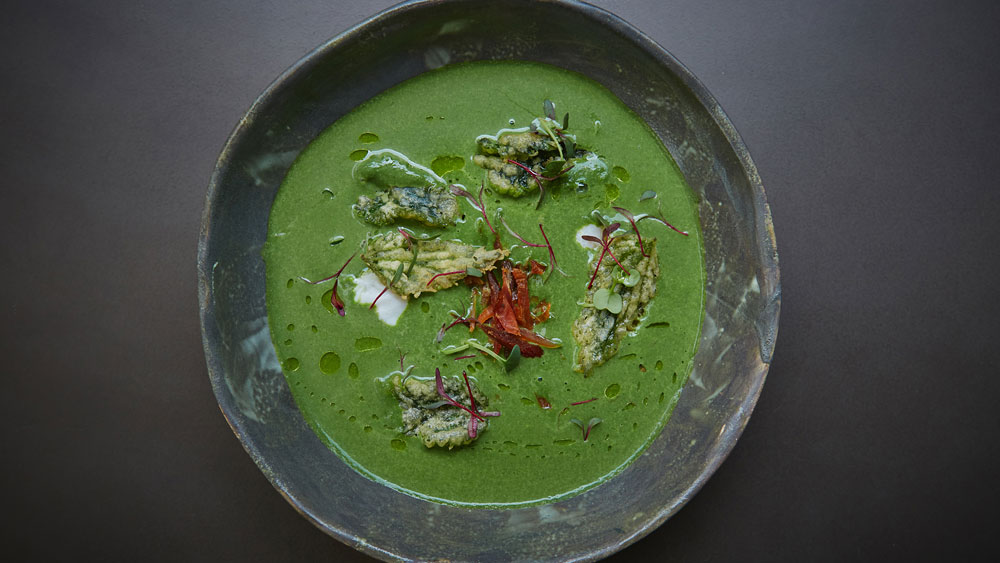 Из зелени с салатными листьями и овощами он делает салат, дополняя его обжаренным в сухарях домашним камамбером, киноа и грейпфрутовой заправкой. Из помидоров рубит тартар и сервирует его с молодым домашним сыром моцарелла, сельдереем и соусом «Кровавая Мэри». Утиную грудку подает с пак-чой, запеченным пастернаком и соусом из копченой груши. Из перловки готовит ризотто с дальневосточным кальмаром и гребешком, зеленое из-за участия в рецепте шпината и крапивы. В холодный свекольник отправляет ростбиф и снег из сметаны, а в крем-суп из крапивы – стружку из вяленого кижуча, перепелиные яйца пашот и листья крапивы в темпуре. На горячее предлагают запеченного донского сома с жареной капустой, булгуром и соусом из сметаны и кимчи. А на десерт – суп из краснодарской клубники со сферами из йогурта и базиликом или «Птичье молоко» с мороженым из клубники и перца чили.