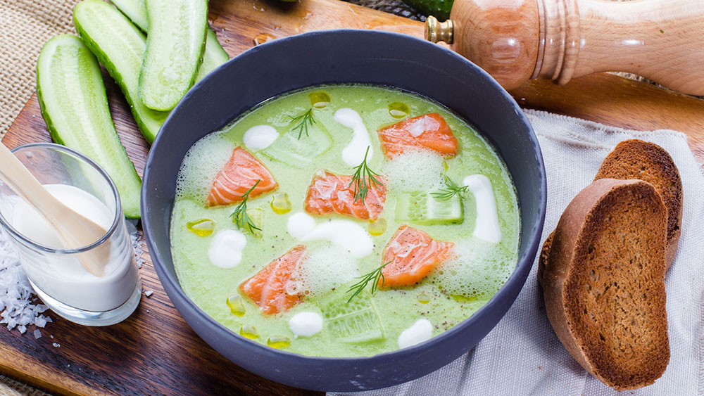 • Холодный суп из огурцов с лососем и натуральным йогуртом — 650 руб.