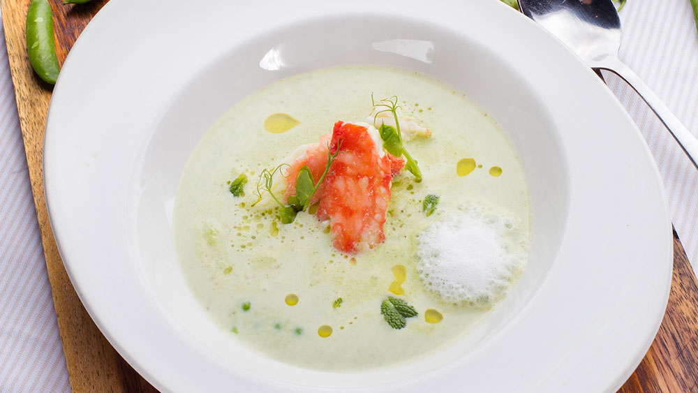• Холодный суп-пюре из зеленого горошка и мяты с крабовым мясом — 1200 руб.