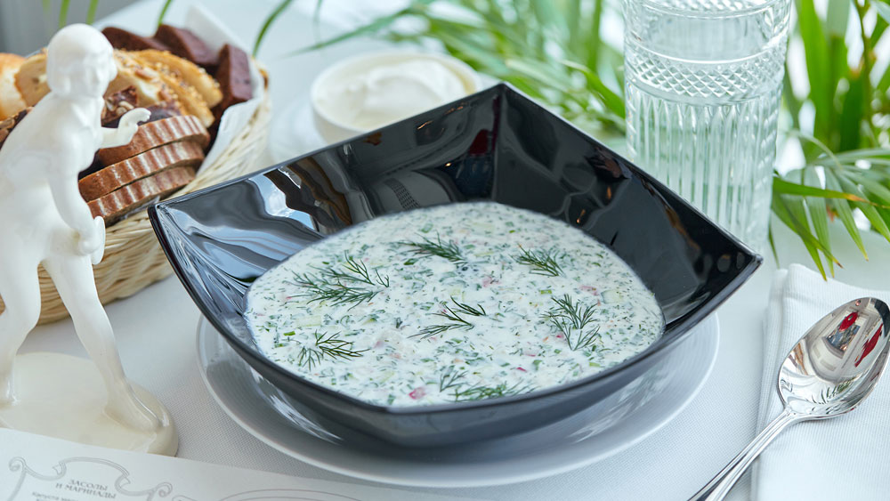 Какое лето без окрошки? Самый главный русский холодный суп в ресторане «Dr.Живаго» готовят в двух вариациях – на кефире (290 р.) и на квасе (370 р.), а еще в свекольник (330 р.) отправляют перепелиные яйца, а в ботвинью (550 р.), сервированную со льдом, командируют раковые шейки.