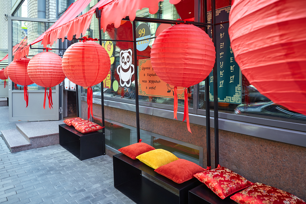 Небольшая веранда «Мандарина» выделяется на традиционном городском фоне: здесь эстетичные лавочки ярко мелькают атласными подушками и красными навесами, украшенными большими круглыми фонариками с ленточками.