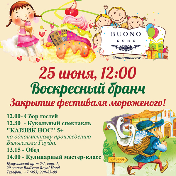 В грядущее воскресенье, 25 июня в ресторане «Buono» ежегодный фестиваль мороженого завершается сезонным семейным бранчем. Кроме поедания всеми любимого лакомства, которого будет невероятное разнообразие вкусов и видов, маленьких гостей ждёт кукольный спектакль «Карлик Нос» и кулинарный мастер-класс.
