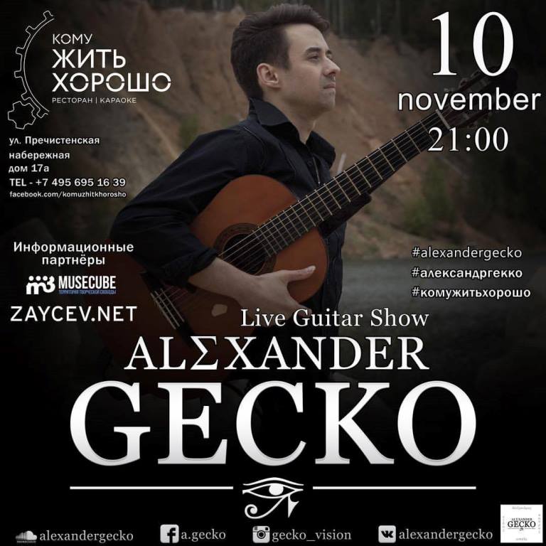 Вечер пятницы принято проводить в хорошей компании и теплой атмосфере - вне зависимости от времени года и погоды за окном. Сегодня в Кому ЖИТЬ ХОРОШО виртуозный музыкант Александр Гекко порадует инструментальными мелодиями современных авторов на свой лад, исполнив их на гитаре.
